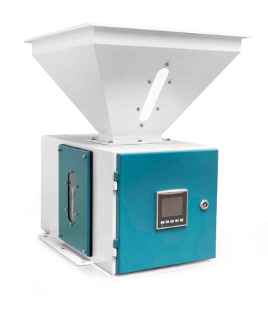 The unit is installed by a load-cell connected to an inclined beating plate at suitable angle, and an impact sensor for appropriate product flow. The weighing process is carried out by the PLC software programmed for a nozzle structure for optimal and precise communication and control settings between the pneumatic control valve and the load cell, and high precision and quick adjustment of high and low flows for the control of product flow. Where the dosing machine operates individually, each machine is controlled by a separate PLC or a certain number of collective groups are formed where data are processed centrally and managed by one PLC unit installed for each group.